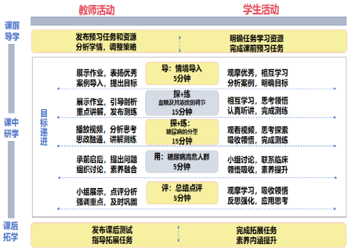 一、 课前导学 课前2天 (一)教师在智慧课堂平台中发布课前任务,通知学生查看并完成。 (二)学生需完成以下任务: 1.预习:第九章糖代谢紊乱检验 第一节“概述”,上传笔记; 2.小组讨论,完成“课前”任务:①查阅资料,了解糖尿病的慢性并发症;②熟练掌握“血糖的来源与去路”,结合“血糖的来源与去路”思考当食用大量甜食后,机体如何降糖; 3.测试:完成针对本节课的知识测练。 设计意图: 我校2022级高职医学检验技术专业学生,基本都是00后,班级中约4/5的同学为高中起点,学生理解能力较强,但自主学习意识尚有待提高。通过课前活动调动学生的参与积极性,并给予平时成绩加分的奖励,鼓励学生在课前开展必要知识的预习,养成良好的学习习惯。 课前测试不仅可以督促学生进行课后复习,还可以帮助教师了解学生上节课知识的掌握情况;上传预习笔记,可以督促学生进行课前预习,养成良好的学习习惯;查阅资料,了解糖尿病的并发症能够提高学生的自学能力,也能知晓本次课程的重要性;根据课前测试情况,调整教学策略。 课前10分钟 (一) 教师发起签到,查看学生的课前测试情况、笔记上传情况,师生现场交流。 (二)学生完成签到,自查课前测试以及课前任务的完成情况。做好上课前的各项准备。 设计意图:做好线上和线下教学的衔接,将学生的思绪引至课堂。 二、课中 (一)课堂导入(5分钟) 1.展示作业:分析并讲解学生课前预习情况,根据评分结果选择学生进行展示;教师点评并进行总结,引起学生学习的兴趣。 2.案例分析 案例内容:某患者,男,29岁,多饮多食多尿,消瘦,近期出现肾功能衰竭,失明。思考: 请做出诊断并分析原因? 设计意图:营造关于糖尿病相关知识的学习氛围,明确本节课的学习目标。 3.明确教学目标 教师结合案例,讲解作为医务工作者,我们该如何做才能降低糖尿病的发病率与致残率? 结合岗位需求与检验士考试大纲,明确本节课学习目标,依据课前测练完成情况,确定本节课的教学难点。 课程形式:理论。 糖尿病的发病率较高而且并发症较多,已经成为严重威胁人类健康的疾病之一。因此作为一名准医务工作者,需要我们掌握糖尿病的相关知识并进行宣讲,提高民众监测血糖的意识,有效降低糖尿病的危害。 设计意图:培养医学检验技术专业大二学生的关爱生命、服务社会的职业素养,增强职业认同感,树立社会主义核心价值观。 (二)新知探究+课堂测练(30分钟) 1.血糖及其浓度的调节(新知探究+课堂测练 15分钟) (1)空腹血糖值 结合案例分析与生活现象,引出空腹血糖值。 (2)血糖的来源与去路 ①随机选人展示作业:当摄入大量食物后,血糖会升高,结合血糖的来源与去路,回答机体如何将血糖降至正常值?检测课前预习情况; ②学生补充后,教师总结,梳理相关知识,在此过程中,渗透爱国教育; ③总结后进行翻转课堂,针对检验士资格考试大纲内容提问,加深大家对“血糖的来源与去路”的理解(课证融合)。 (3) 血糖浓度的调节 ①根据血糖的来源与去路,引出血糖浓度的调节; ②教师先系统讲解降糖机制与升糖机制,将胰岛素比作外卖员,形象的讲解胰岛素降糖与升糖的机制; ③根据课前测练结果,提出本节课的重点为降糖的机制,引起学生重视,同时提出问题引导学生思考降糖的激素、产生胰岛素的细胞、引出胰岛素原与C肽,重点讲解胰岛素降糖机制,强化本次课程的重点与难点。 (4) 课堂测练(以赛促学) 学生在智慧课堂完成测练,教师根据完成情况,对薄弱知识点进行强化。 设计意图:利用探究学习法,吸引学生学习的兴趣,开展新内容的学习;通过成果展示法,检验大家预习的情况,教师总结强化,加深对知识的理解,利用翻转课堂弥补预习中的不足,做到课证融合;提出国家粮食储备,渗透爱国主义思政教育;教师讲解后对血糖及其浓度调节知识进行线上测练,做到以赛促学,检测大部分学生的掌握情况,激发学习兴趣。 重难点突破方法:以任务为导向,通过生活现象引任务→小组展示→教师讲解→翻转课堂→探究学习→教师讲解→掌握重难点。 2.糖尿病及其代谢紊乱(新知探究+课堂测练 15分钟) (1)糖尿病的概念 学生思考正常人体内有胰岛素降糖,那糖尿病人的血糖为什么会高?换言之,糖尿病患者的血糖为什么降不下来?引出糖尿病的概念。 (2) 糖尿病的分型 ①图片观察,思考为什么都是糖尿病患者,体型却不一样,引出糖尿病的分型; ②再次引用案例分析,根据预习情况,引导学生智慧课堂投票初步判断患者是几型糖尿病,激发学习兴趣; ③教师讲解1型糖尿病,点出重点; ④观看视频,思考为什么2型糖尿病患者的胰岛素有运输不完的葡萄糖?引出2型糖尿病患者的体型特征; ⑤将葡萄糖比作粉笔,将细胞比作粉笔盒,将手比作胰岛素,讲解2型糖尿病患者的特点; ⑥展示图片,拓展肥胖者发展为2型糖尿病的前兆; ⑦通过电视剧情节使大家知晓妊娠期糖尿病的危害,引起重视,同时引出我国关于避免造成妊娠期糖尿病严重后果的措施——糖耐。 (3)小组讨论(融会贯通) 以小组为单位,列表讨论1型糖尿病与2型糖尿病的区别,增强学习效果的同时促进小组合作。 设计意图:利用探究学习法,吸引学生学习的兴趣,开展新内容的学习;通过任务驱动法,提升学生的学习能力和学习兴趣;通过形象的比喻,简化知识点;通过引入黑棘皮病,消除大家的歧视心理,平等对待每一个人;电视剧情节,引