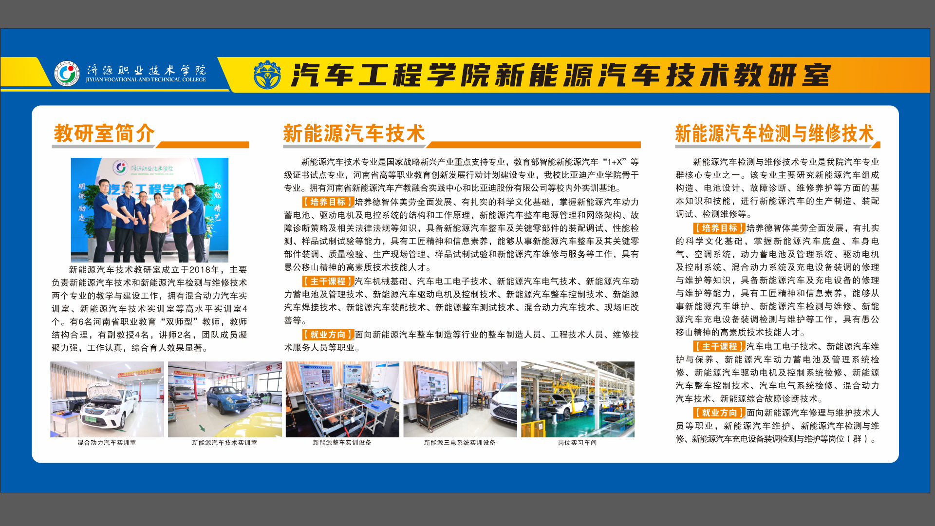 新能源汽车技术教研室成立于2018年,主要负责新能源汽车技术和新能源汽车检测与维修技术两个专业的教学与建设工作,拥有混合动力汽车实训室、新能源汽车技术实训室等高水平实训室4个。有6名河南省职业教育“双师型”教师,教师结构合理,有副教授4名,讲师2名,团队成员凝聚力强,工作认真,综合育人效果显著。