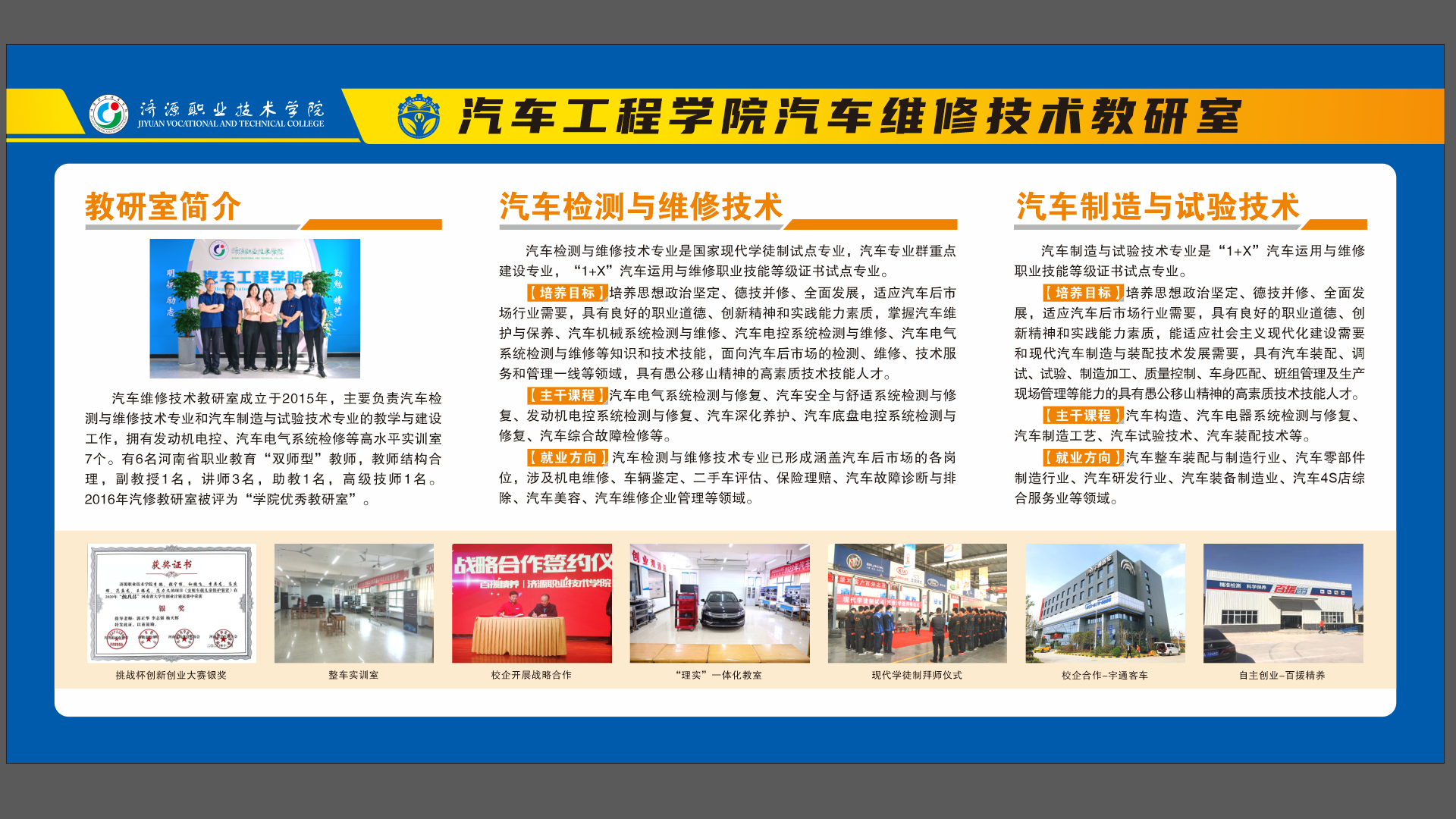 汽车维修技术教研室成立于2015年,主要负责汽车检测与维修技术专业和汽车制造与试验技术专业的教学与建设工作,拥有发动机电控、汽车电气系统检修等高水平实训室7个。有6名河南省职业教育“双师型”教师,教师结构合理,副教授1名,讲师3名,助教1名,高级技师1名。2016年汽修教研室被评为“学院优秀教研室”。