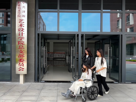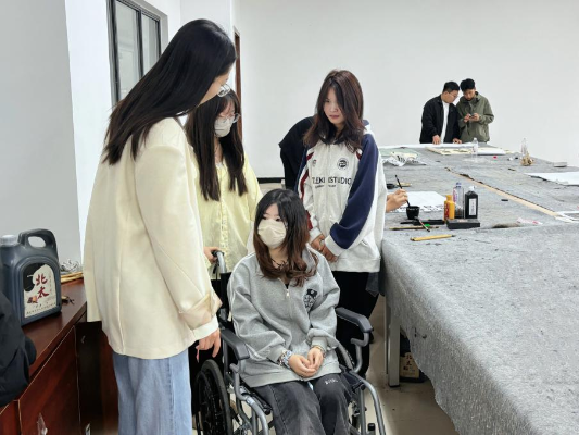 第一次推轮椅时,室友们闹了不少笑话。朱同学因用力过猛差点撞到台阶,王同学因刹车太急让袁同学感受到了“颠簸”,但她们没有放弃,而是利用课余时间学习轮椅操作技巧,以至于能熟练应对各种路况,确保袁同学的安全与舒适。此外,室友们还化身“课代表”,课前帮袁同学找好位置,搀扶她入座,并协助她带好书画工具,让她感受到集体的力量。