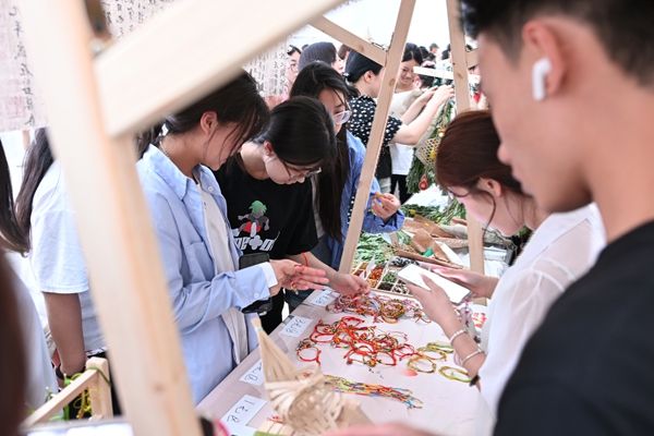 活动现场设置端午限定工坊和非遗文化体验两大区域。工坊区内,师生们亲手制作祈福手绳、艾草门挂等端午特色手工艺品;非遗体验区则展示了天坛砚拓印、漆扇制作等传统技艺,葫芦烙画、李氏布艺等非遗项目更是引来阵阵赞叹。