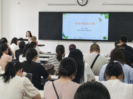 李梅主任特别注重与现场教师的互动交流。通过“举例子”引导教师识别自身情绪模式,借助“谈感受”环节鼓励大家分享体验与困惑,并以“畅未来”的方式启发教师将积极情绪的培养融入日常工作和生活实践。整个讲座氛围轻松活跃,教师们积极参与讨论,在思想的碰撞中深化了对积极情绪的理解,也收获了实用的心理调适技巧。