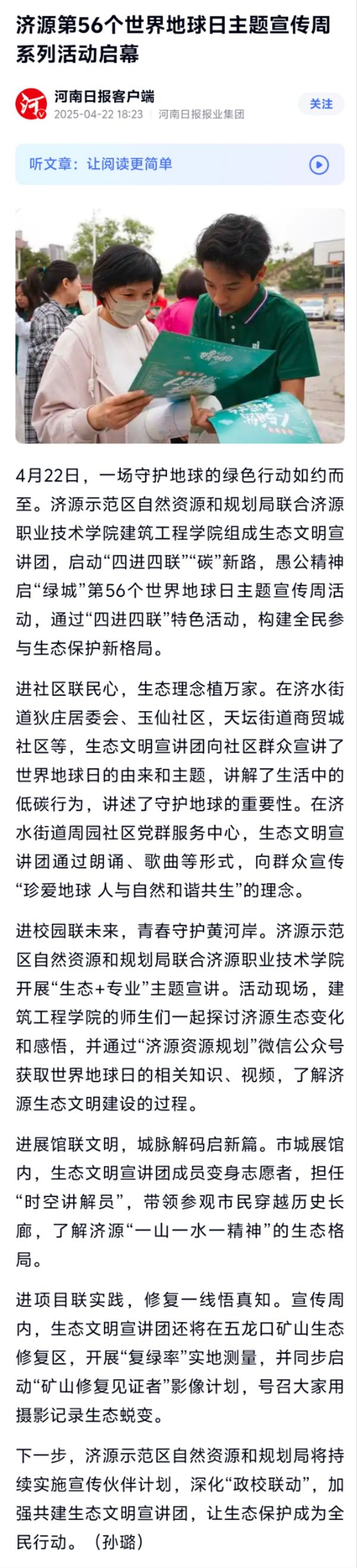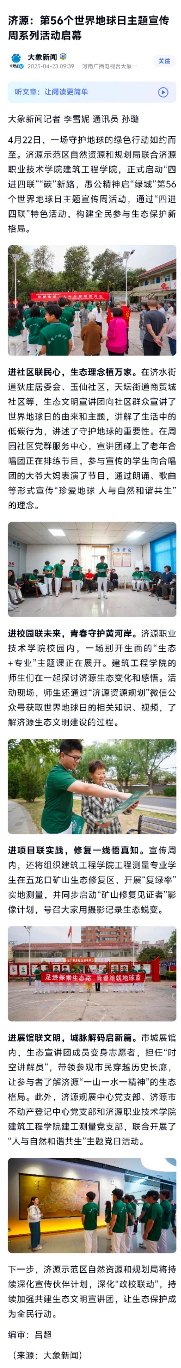 转自2025年4月22日大象新闻、河南日报客户端:济源第56个世界地球日主题宣传周系列活动启幕